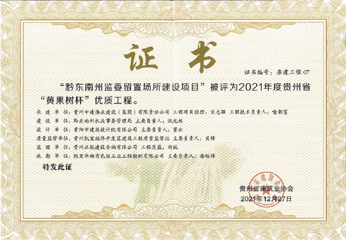 “黔東南州監(jiān)委留置場(chǎng)所建設(shè)項(xiàng)目”榮獲2021年度貴州省“黃果樹(shù)杯”優(yōu)質(zhì)工程獎(jiǎng)