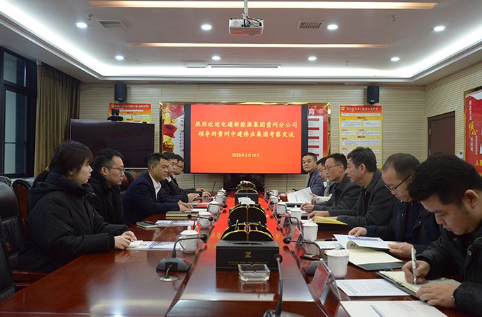 為深化黔東南州新能源資源的合作開發(fā)利用,2023年2月10日,央企中電建新能源集團(tuán)貴州分公司副經(jīng)理鐘輝一行赴中建偉業(yè)集團(tuán)公司考察交流,達(dá)成初步合作意向。貴州中建偉業(yè)集團(tuán)公司黨委副書記、總經(jīng)理馮安翔在集團(tuán)公司17樓會議室熱情接待并主持座談,黨委委員、副總經(jīng)理王引明、王振田,董事長助理張政雄、總經(jīng)理助理田應(yīng)欽、經(jīng)營部經(jīng)理王劍和參加座談。